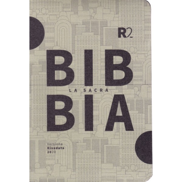 Bibbia tascabile nella versione R2 (Riveduta 2020) con copertina rigida effetto tessuto illustrata con uno scenario cittadino, fondo beige, scritta ed elementi grigio scuro.